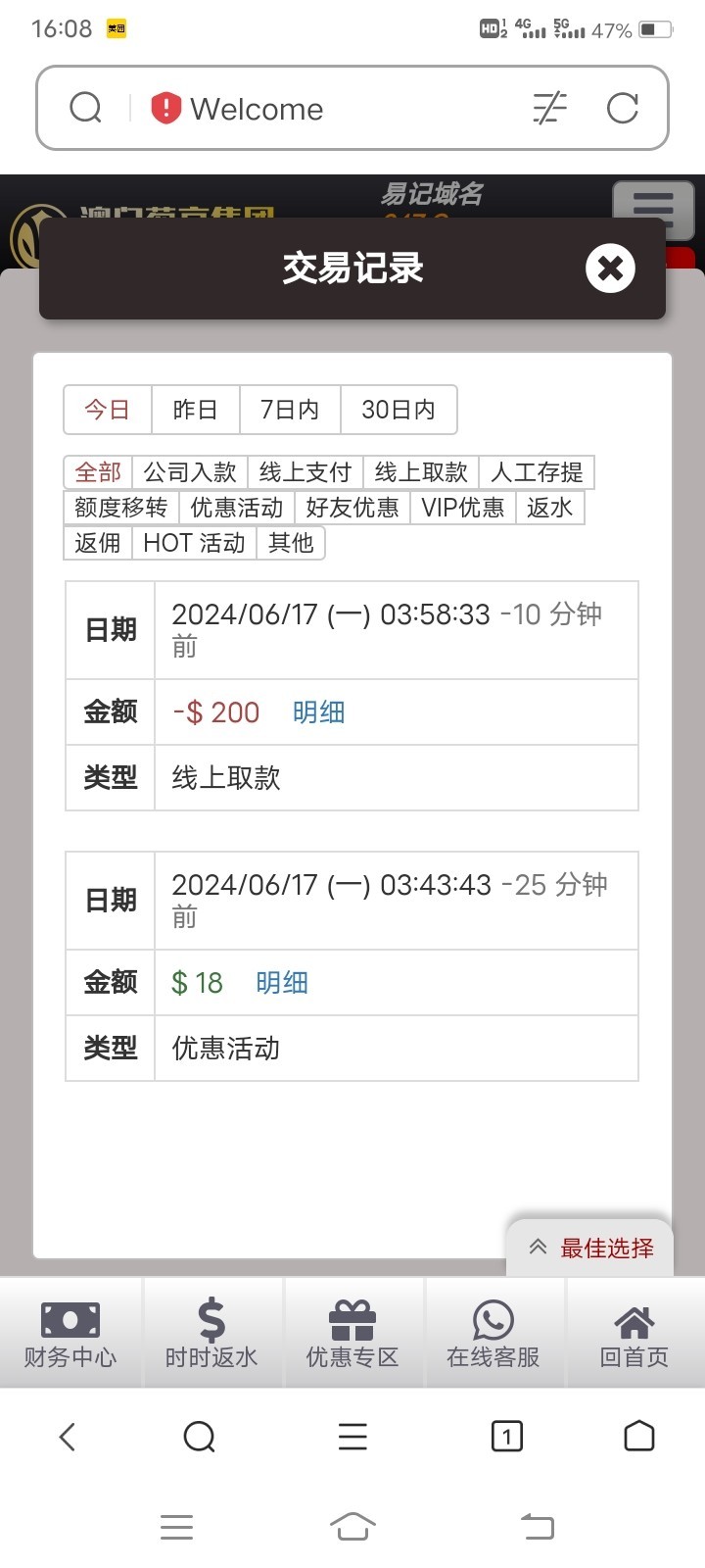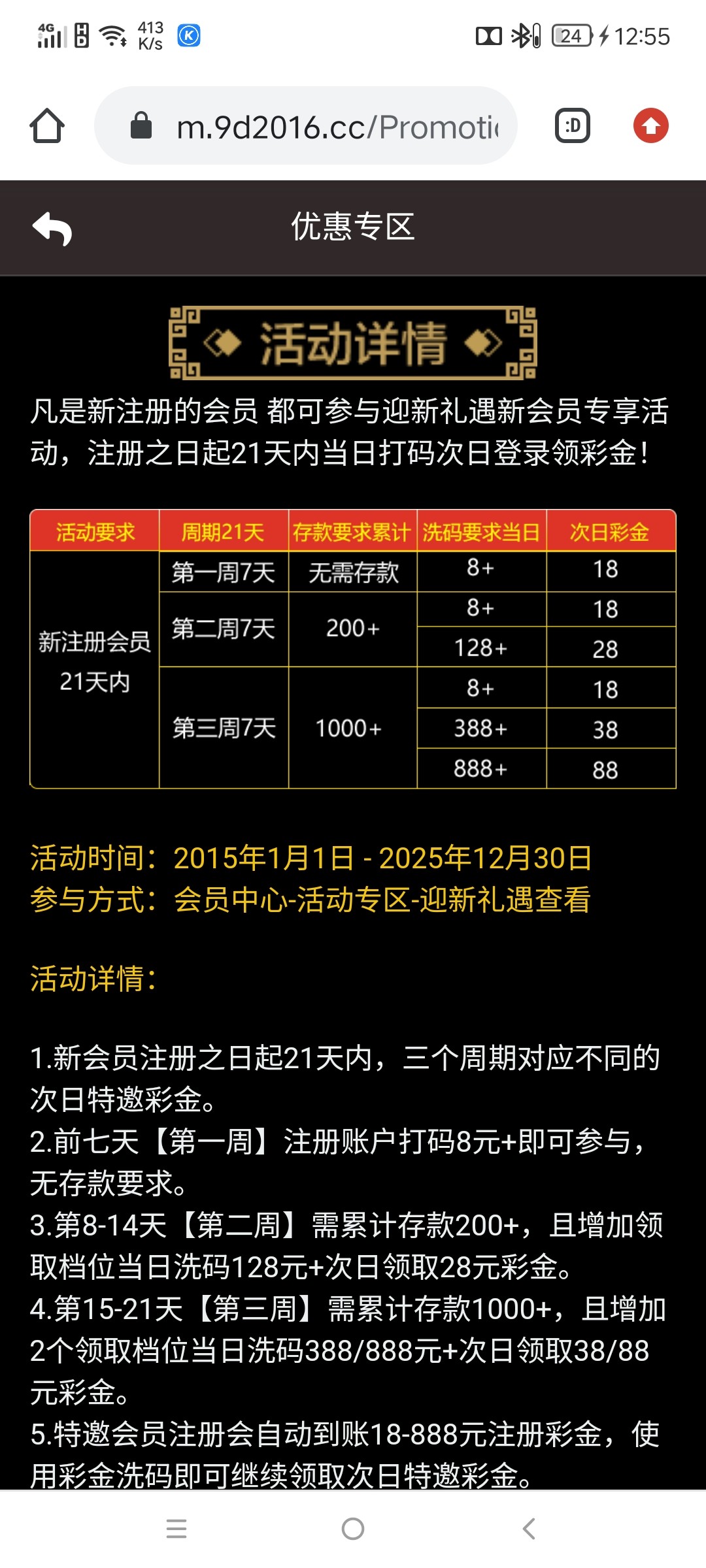 注册秒18 然后第一周每天只要打码八块以上 第二天都送18 意思就是说第一周每天登陆都送18块 出款应该是半黑吧,