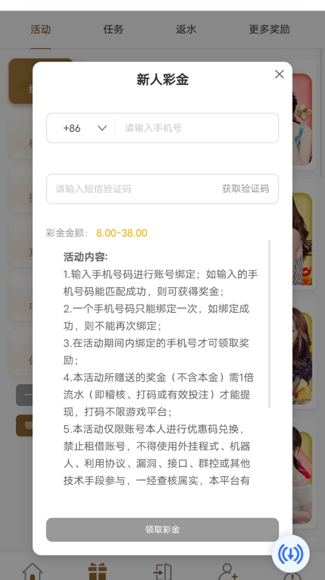 新用户注册优惠大厅自助申请新人彩金输入手机号碰瓷送8-38不送就是不符合