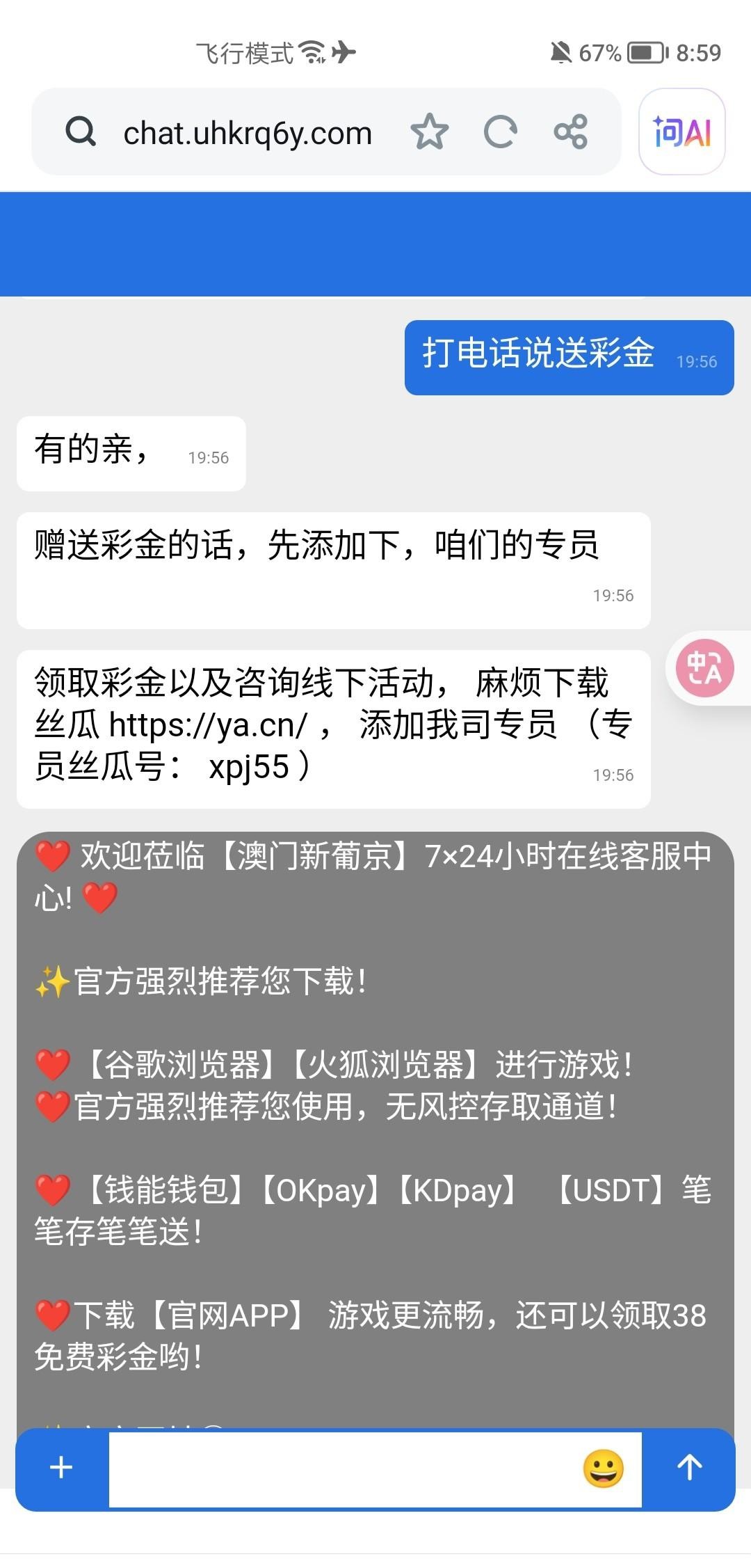 打电话说送彩金 要下载丝瓜加专员 送了38联系方式看图 我这没查手机号就送了 可以去碰瓷一下试试 平台网址80078.vip我没打出来 黑不黑自测 不要充值