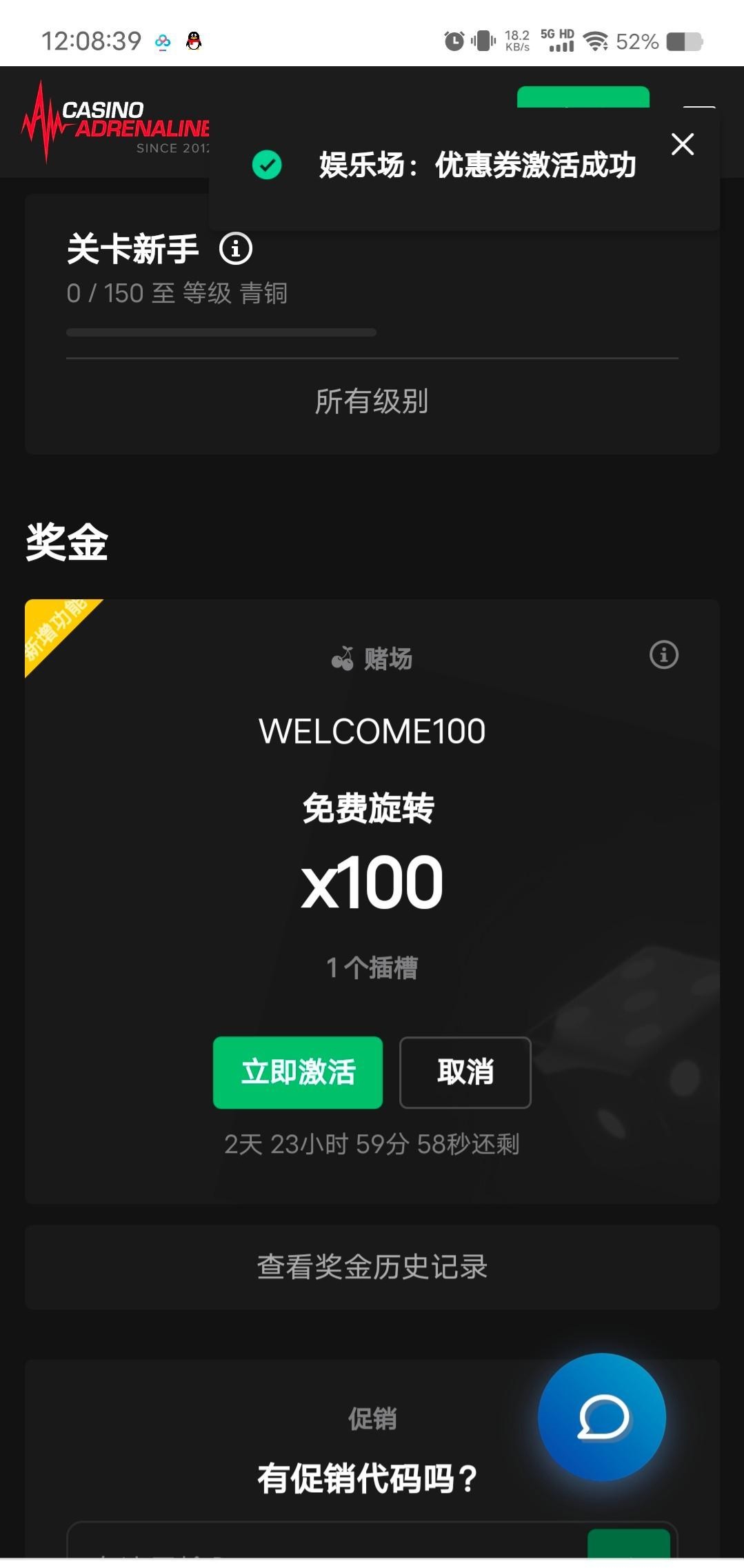 邮箱注册,选择美元,注册后会发邮件,要去邮箱验证,促销里输入兑换码WELCOME100,免费旋转转完需要打40倍流水,提现自测。看不懂的去翻译中文。网址https://www.casinoadrenaline.com/profile/promo/casino