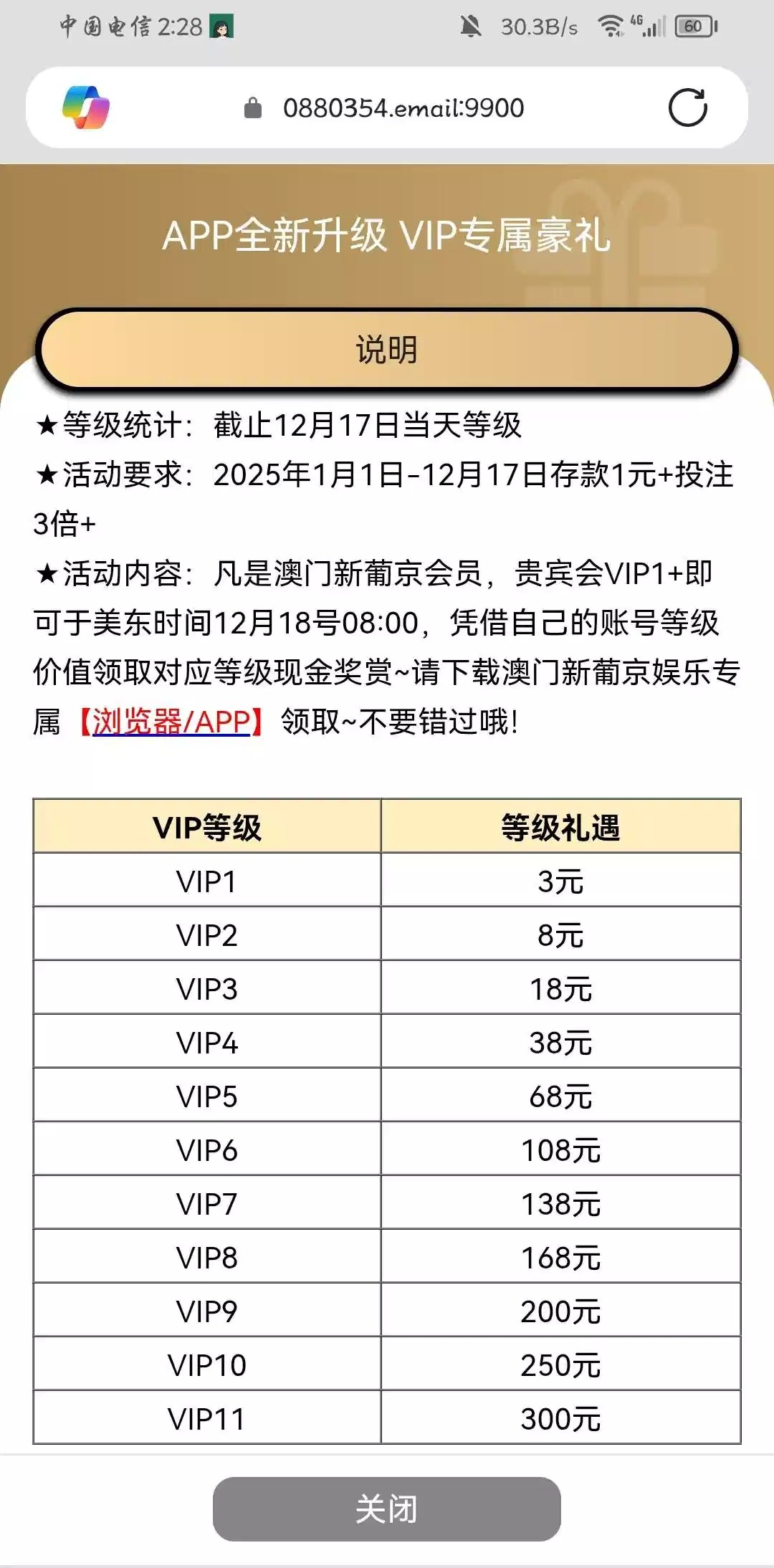 以前玩过有vip等级的今年没充值的去充几块钱,今天最后一天,不然到时候又拍大腿